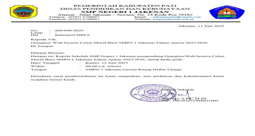 Berikut kami sampaikan Surat Undangan terkait informasi MPLS SMPN 1 Jakenan Tahun Ajaran 2025/2026. Bisa diunduh di link berikut ini Surat Undangan